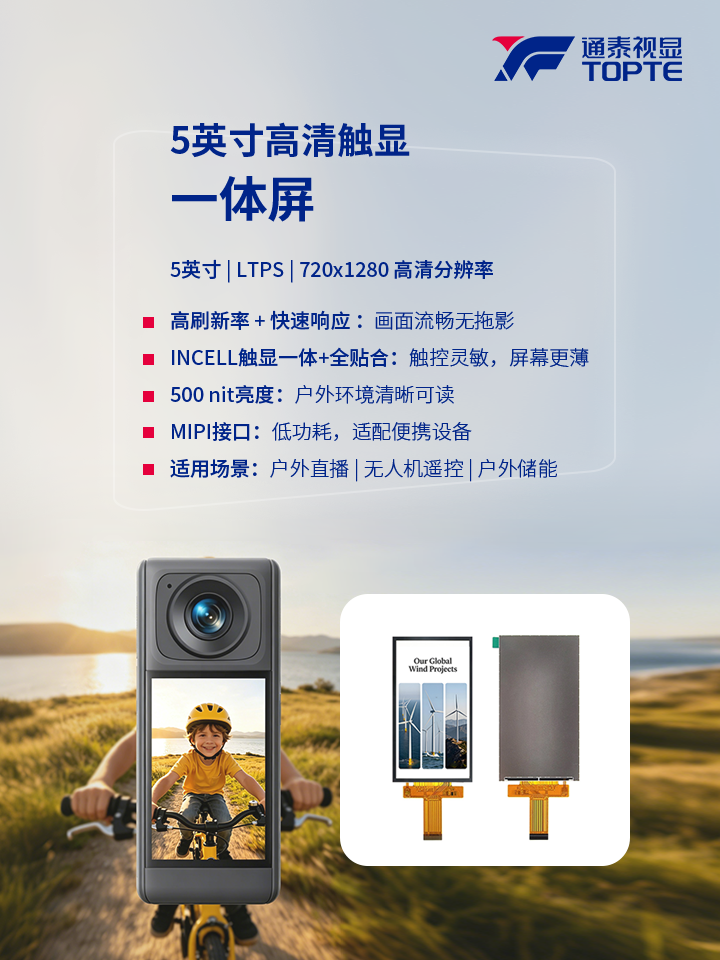 从户外直播到无人机遥控,从手持PDA到储能电源,通泰视显5寸LTPS高清触显一体屏具备的高透过率、In-Cell全贴合、500nit高亮、MIPI接口的核心特点,为户外设备提供了一款真正“看得清、摸得准、靠得住”的显示模组方案。